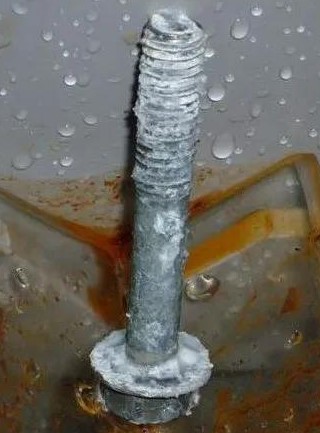 白銹呈白色絮狀,結(jié)構(gòu)松散,去除后在鍍層表面對應位置會留下黑色斑跡,表明鍍層已經(jīng)失去防腐作用,進一步腐蝕則會呈現(xiàn)紅銹狀態(tài)。